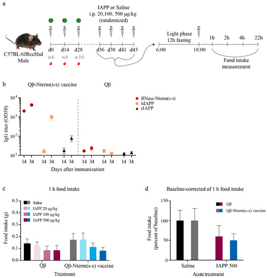 IAPP physiological function is maintained in the presence of anti-IAPP antibodies. (a) C57BL/6 male mice were immunized with the Qβ-Nterm (s-s) vaccine (n = 16) or with the uncoupled Qβ-VLPs (n = 14) at day 0 (week 6), day 14 (week 8) and day 28 (week 10), serum was collected at day 14 and day 34 (b) to check antibody titer. On days 36, 38, 41 and 43, mice were fasted during the light phase period for 12 h. Mice then received either IAPP or the control saline solution immediately prior to dark onset and food intake was measured 1, 2, 4 and 22 h after injection. (b) Serum antibodies were analyzed for recognition of the N-term (s-s) peptide coupled to RNase (RNase-N-term(s-s) in red), hIAPP (in peach) and rIAPP (in black) for the Qβ-Nterm (s-s) (left panel) and the Qβ-VLP (right panel)-immunized mice. (c) Cumulative food intake after 1-h refeeding and (d) baseline correction for the IAPP versus saline group in Qβ and Qβ-Nterm (s-s)-immunized mice. Additional time points can be seen in Supplementary Figure S2. Data are the means ± SEM. RNase-N-term (s-s), N-term (s-s) peptide coupled to RNase; rIAPP, rat IAPP; hIAPP, human IAPP. Statistical test in (c,d): 2-way ANOVA and Sidak’s multiple comparison. No significant difference was observed in (c,d) (p > 0.05).
