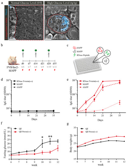 hIAPP transgenic mice were fed HFD starting at 4 weeks of age and received the first immunization at week 6 (day 0) with Qβ-N-term (s-s) or uncoupled Qβ as control. Mice were then boosted at week 8 (day 14) and at week 10 (day 28) (Figure 5b). Sera were collected weekly (last collection at day 35; Figure 5b) and analyzed for specificity (Figure 5c). IgGs derived from Qβ control-immunized mice, as expected, did not recognize any peptide complex (Figure 5d). In contrast, IgGs from immunized mice recognized the RNase-N-term (s-s) peptide complex as well as the hIAPP (Figure 5e). To detect the onset of T2DM and disease progression, fasting glycemia was measured weekly. The Qβ control mice showed progressive hyperglycemia starting at 9 weeks of age (Figure 5f). In contrast, the Qβ-N-term (s-s)-immunized mice only showed mild hyperglycemia starting at 12 weeks of age. Importantly, Qβ-N-term (s-s) vaccination also protected mice from hyperglycemia-induced loss in body weight (Figure 5g).