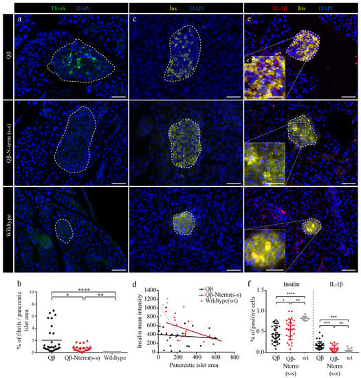 Collectively, our data indicate that Qβ-N-term (s-s) is efficient at delaying onset of hyperglycemia, caused by a reduction of amyloidogenic deposits together with a local reduction of the pro-inflammatory cytokine IL-1β.