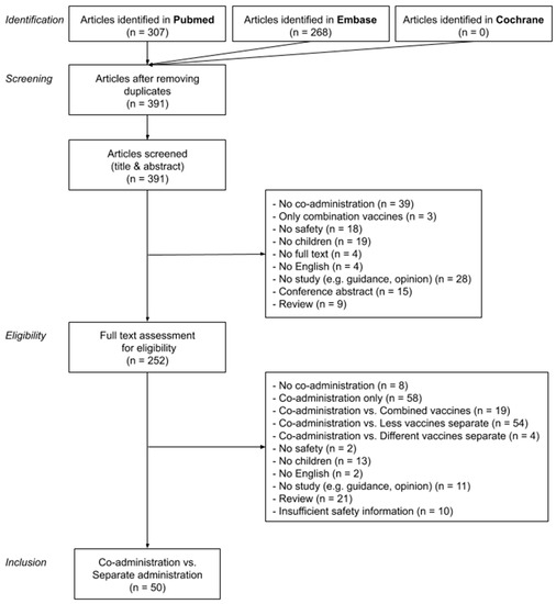 We performed a systematic literature review of studies assessing the safety of vaccine co-administrations in children in line with Preferred Reporting Items for Systematic Reviews and Meta-Analyses (PRISMA) guidelines. Our search strategy aimed to retrieve studies in the pediatric population, who received more than one vaccine at the same time for which adverse outcomes were reported. We searched Pubmed (including Medline), Embase, and the Cochrane library for articles in English, published between 1999 and 2019 to cover vaccines and co-administrations relevant to actual immunization practices, combining the following keywords: