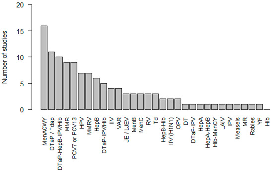The most frequently investigated co-administered vaccines included MenACWY vaccine (n = 16, 32%), DTaP or Tdap vaccines (n = 11, 22%), DTaP-HepB-IPV/Hib vaccine (n = 10, 20%), MMR vaccine (n = 9, 18%), and PCV7 or PCV13 vaccines (n = 9, 18%) (Figure 2). Supplementary Table S1 provides an overview of the study characteristics and findings of all studies comparing co-administered vaccines versus the same vaccines administered separately. The full meaning of vaccine abbreviations can be found in Supplementary Table S2.