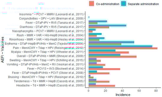 Of the five studies identifying significantly fewer AEFI, one study reported significantly less diarrhea (RD: −20.3%, RR: 0.5) and pyrexia (RD: −11.3%, RR: 0.5) following co-administration of DTaP-IPV + RV5 [17]. One study reported significantly less injection site erythema (RD: −15.4%, RR: 0.7) following DTaP-HepB-IPV/Hib + MenC co-administration [18]. One study reported significantly less rash (RD: −5.8%, RR: 0.6) and rhinorrhea (RD: −6.1%, RR: 0.7) after + MMR + VAR + Hib-HepB co-administration compared to separate administration [19]. One study reported significantly less nasopharyngitis (RD: −3.5%, RR: 0.6) and insomnia following co-administering PCV7 + MMRV compared to separate administration [20]. One study reported significantly less conjunctivitis (RD: −0.7%, RR: 0.1) after co-administering OPV and LAIV compared to separate administration [21]. The reported incidences of AEFIs are presented in Figure 4. Supplementary Table S1 provides a summary of the major study characteristics.