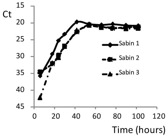 Dynamic growth of the three Sabin strains in HEp-2C cells infected with 100 CCID50 of each of the three Sabin strains simultaneously. Ct: quantitative PCR cycle threshold.