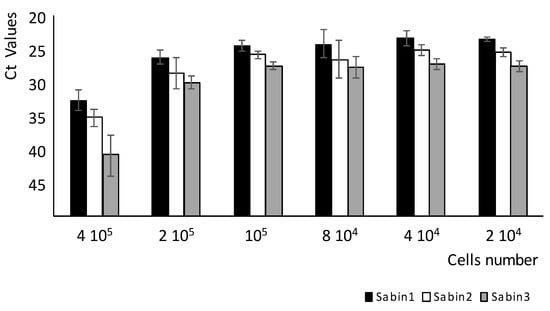 In the next experiments, the effect of the number of cells in the assay on virus quantitation was studied. Different number of HEp-2C cells were added to the mixture of 100 CCID50 of each of the three Sabin strains and incubated for 42 h. Next, the cells were lysed and analyzed with qmosRT-PCR as described above. The resulted Ct values were plotted against the number HEp-2C cells (Figure 2). This result showed that 2 × 104 to 2 × 105 cells harvested at 42 h resulted in consistent and the lowest Ct values (i.e., highest number of viral genome copies) for all three Sabin strains. Therefore, the cells number of 4 × 104 cells was chosen as an optimum number of cells for the assay. This wide interval of cell number (2 × 104 to 2 × 105cells) that resulted in the highest number of the quantified viral genome copies suggests the robustness of the MPBN assay (see Section 3.3 below).