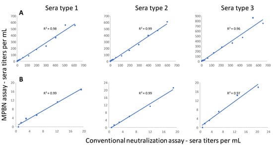 For a more detailed analysis, the results for low-titer sera (from the data presented in Figure 4A) are presented separately in Figure 4B. These data show that the results of both assays correlate well with R2 values of 0.96 for serum type 1, 0.99 for type 2 and 0.97 for type 3. The results of the lower limit of titration (LLOT) analysis presented below are a part of this correlation study which showed that the MPBN assay accurately determined neutralization titers in low-titer sera.