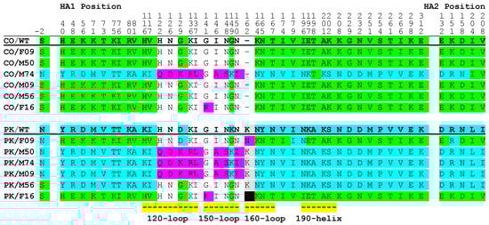 The changes in the antigenic loops followed different patterns. Some changes were common in the escape viruses even though the viruses were from different lineages and derived using different sera. For example, identical changes to the 120- and 150-loops were observed for the CO/M74, PK/M74, PK/M50, and PK/M09 viruses (Figure 1). Some changes were specific to a particular serum. At position 129 (HA1 numbering) there was a glycine to lysine change in CO/M74. Similarly, the PK/M74 escape virus also changed to a lysine at this position, albeit from an aspartic acid. Substitutions at this position have been reported for both IBV lineages indicating that it is a variable position [30]. At position 141 (HA1 numbering) there was a glycine to arginine change in both the CO/F16 and PK/F16 viruses. Finally, some changes in the antigenic loops made the escape virus from one lineage more like the other lineage (changes to the 150-, 160- and 190-loops in CO/M74, PK/F09 and PK/F16, and changes to the 120-loop in PK/M56 and PK/F16 for example).