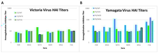 The changes observed in the HA coding regions of the escape viruses are expected to result in viruses that bind fewer antibodies from the sera used to generate them. We measured HAI titers of the sera toward the wild-type B/Colorado/06/2017 virus and two of the escape viruses, CO/M74 and CO/F16. Due to limited sera samples we restricted the experiments to the viruses with the most divergent sequences. The titers to the CO/WT virus were low overall but a trend for higher titers for the sera from the subjects that had the highest titers to the IBV vaccine antigen (Figure 2A). We measured HAI titers of the sera toward the wild-type B/Phuket/3073/2013 virus and two of the escape viruses, PK/F09 and PK/M09. The titers to the PK/WT virus were higher for the sera from the subjects that had the highest titers to the IBV vaccine antigen (Figure 2B). The titers toward the PK/F09 and PK/M09 viruses were lower than those for PK/WT in all instances except for the F16 sera toward the PK/M09 virus. The PK/F09 virus had changes that made the backbone more like the Victoria lineage viruses and sera titers were lower for this virus than the PK/M09 virus which had changes to the antigenic loops. Our results show that the HAI titers are generally lower with the escape mutants indicating that fewer antibodies in the sera are able to bind. The notable exceptions are the PK/M09 and PK/M56 viruses in the F16 sera indicating that the F16 sera (which had high titers toward the vaccine antigen) has an antibody repertoire that differs from the M09 and M56 sera.