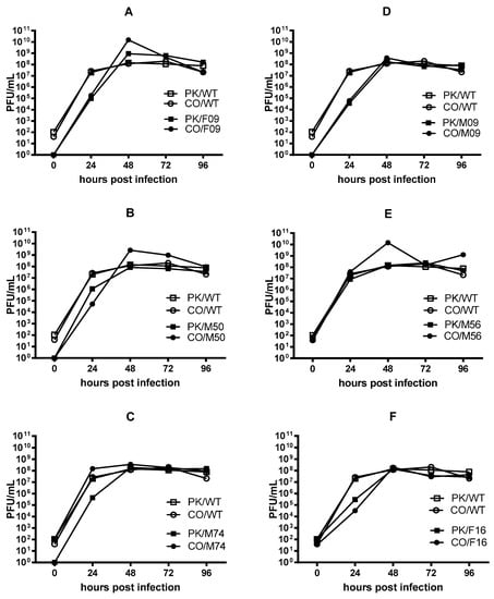 We compared the growth of the escape viruses. MDCK cells were inoculated with a low multiplicity of infection (MOI = 0.001). The inoculum was removed after one hour and replaced with media. Aliquots were taken at different timepoint and titers determined using the plaque assay on MDCK cells. Titers were detected at the 0-h timepoint indicating that some inoculum remained that included unbound virus. The initial growth rates for the escape viruses paralleled those of the wild-type viruses in most instances regardless of the original titer. The CO/F16 and PK/F16 viruses had slightly lower titers after 24 h but all viruses reached titers comparable to the parental strains after 72-h (Figure 3). This indicates that the changes to the viral population did not affect growth.