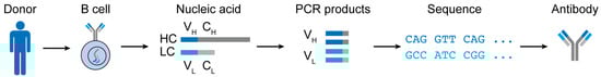 Figure 2. Analyzing B cell receptors from human donors. B cells are isolated, and DNA or RNA is extracted and subjected to B cell receptor sequence amplification. Amplicons are sequenced and can be used for recombinant antibody production. HC: heavy chain, LC: light chain, V: variable region, C: constant region, VH: heavy chain variable region, VL: light chain variable region.