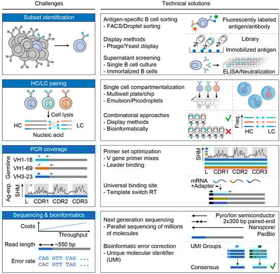 Classical Sanger sequencing is frequently employed in the analyses of B cell receptor subsets such as antigen-specific memory B cells in the blood [34,79,80]. Due to the inability to sequence bulk-amplified heavy and light chains, next generation sequencing (NGS) techniques such as pyro-, ion-semiconductor-, or illumina dye sequencing are typically preferred over sanger sequencing for high-throughput analyses [50,51,52,53,54,55]. However, they often suffer from shorter read lengths and higher error rates. Molecular barcoding techniques and bioinformatics pipelines have been developed to account for both PCR- and sequencing-induced errors [81]. To this end, unique molecular identifiers (UMI) are introduced during cDNA generation by template-switching reverse transcription. Moreover, protocols for long read parallel sequencing (e.g., SMRT and Nanopore sequencing) have been recently applied to analyze BCR sequences [63,82].