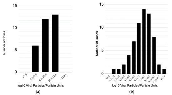 Frequency of dose magnitudes for all adenoviral vector vaccine dose-response studies with doses measured in VP/PFU in (a) humans and (b) mice.