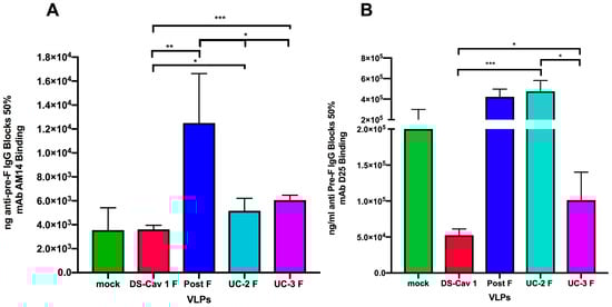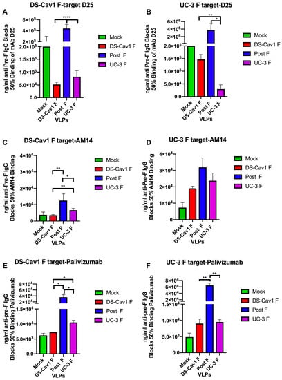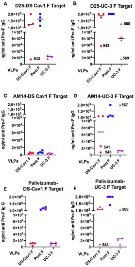 We have previously compared the relative specificities of murine antibodies induced by different VLPs measuring the concentration of anti-pre-F binding IgG in sera that will block the binding of pre-fusion specific mAb D25 and AM14 []. We reported that fewer ng of total anti-pre-F IgG in DS-Cav1 F, UC-2 F, or UC-3 F VLP sera compared to post-F VLP sera were required to block 50% binding of the pre-fusion specific mAbs. That is, the DS-Cav1 F, UC-2 F, and UC-3 F VLPs induced sera that had a higher concentration of D25-blocking and AM14-blocking antibodies/ng of total anti-pre-F binding IgG than the sera from post-F VLP immunization, as expected.
