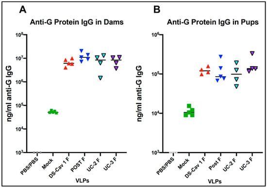 There are no significant differences between levels of anti-G IgG in dams or in levels in the pup sera, although the levels of antibodies in dams were approximately 100-fold higher than the levels in pups. Thus, the differences in the levels of total anti-G antibodies cannot account for the different responses to the different VLPs.