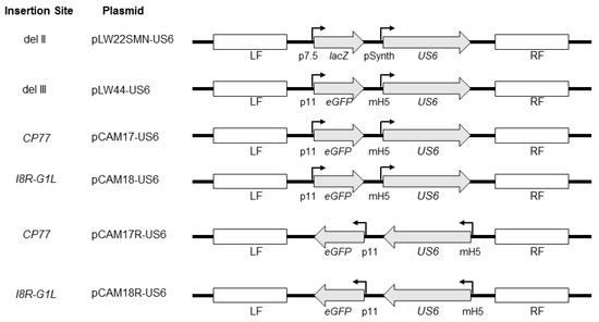 3.3. Stability of US6 at the CP77 Locus and I8R-G1L Intergenic Region