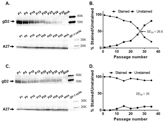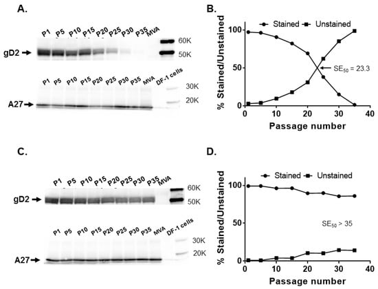 Monolayers of DF-1 cells in 6-well tissue culture plates were infected with MVA-gD2 vectors, at an approximate MOI of 0.1. Following virus adsorption for 2 h, infection medium was aspirated, and 1 mL of fresh DMEM growth medium added to each well. Infected cells were incubated for 48 h, followed by three freeze–thaw cycles to release virions. The lysates were clarified by low-speed centrifugation at 1000 rpm for 10 min at 4 °C and stored at −80 °C as the inoculum for the next passage. This process was repeated 35 times for each recombinant MVA vector. MVAdel2-gD2 was also passaged 35 times in BHK-21 cells.