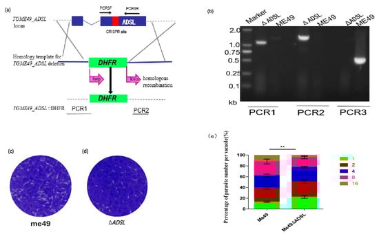 ADSL (TGME49_277760) deletions in ME49 strains were performed by the CRISPR/Cas9 system, which utilized homologous recombination to replace the target gene, and the associated method was performed as described previously [27,28]. Briefly, the resistance cassette loxp-DHFR*-loxp was amplified from pDONR-G265-loxP-DHFR*-loxp, and 1-kbp 5′- and 3′-homology arms were obtained from the genomic DNA from ME49 strains. These fragments were concatenated into the pUC19 vector and then assembled into the pADSL:loxp-DHFR*-loxp plasmid, which can serve as a template to replace ADSL with loxp-DHFR*-loxp. All the primers used during plasmid construction are listed in Table 1, and all plasmids were proven to work by DNA sequencing before use. Furthermore, we modified pSAG1:CAS9-U6:sgUPRT to replace the UPRT targeting guide RNA (gRNA) with a single-guide RNA (sgRNA) that disrupted the ADSL gene by using Q5 site-directed mutagenesis. Toxoplasma gondii ME49 was transfected with the linearized pADSL:loxp-DHFR*-loxp homologous fragment and ADSL-specific CRISPR plasmid as previously described [27,28] and selected with 1 µM pyrimethamine (Life Technologies, Inc., Rockville, MD, USA).