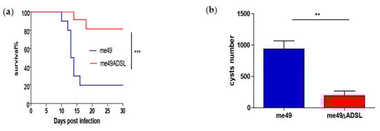 The consequences of ADSL deletion on the acute infection stage of the parasite were studied by performing a survival curve analysis. Briefly, 100 tachyzoites of both the parental strain ME49 and ADSL deletion mutants that were infected intraperitoneally into mice, and the survival rate results are shown in Figure 2a. That the survival rates at 30 days for the ME49 and ΔADSL mutants groups were 20% and 70% Figure 2a, respectively, indicated that ADSL deletion led to attenuated virulence of the parasite. Subsequently, brains were collected in survivor mice at 30 days post-infection, and brain cysts were quantified by DBA-FITC staining. The cyst number in ΔADSL mutants was significantly reduced and was compared with that of the ME49 strain under the same experimental conditions. The result is shown in Figure 2b.
