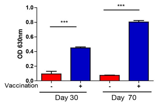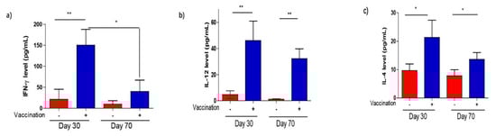 To further explore the immunogenicity of ΔADSL, the specific anti-T. gondii IgG antibody level was detected by ELISA in sera samples that were acquired from vaccinated mice at 30 and 70 days. The results showed that the IgG titer in immunized mice was significantly higher than that in non-immunized mice at 30 and 70 days Figure 4. However, IgG levels were relatively stable over time (Figure 4) for immunized mice. The results suggested that ΔADSL strain infection elicited a strong humoral response. Subsequently, we also collected vaccinated mouse sera at 30 and 70 days to measure the levels of Th1 (IFN-γ and IL-12) and Th2 (IL-4) cytokines by ELISA. The IFN-γ-IL-12 axis, serving as a representative of Th1-type cells, mediates the main cellular immune response to T. gondii. The levels of these cytokines were significantly elevated at 30 and 70 days compared to those in control mice (Figure 5a–c). Mice immunized for 70 days showed a significant decrease in IFN-γ levels compared to those immunized for 30 days (Figure 5a). In summary, these results suggested that vaccination with ΔADSL induced cellular and humoral immune responses against secondary infections of T. gondii.