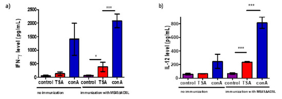 To verify the antigen recall response of immunized mice, we checked the cytokine levels of splenocytes that were infected with the ADSL mutant for 150 days and non-immunized mice that were used as a control. The splenocytes were stimulated with TSA prepared as described above, and culture supernatants were used to detect the IFN-γ and IL-12 levels by ELISA. The results showed that TSA stimulated high levels of the pro-inflammatory cytokines INF-γ and IL-12 (Figure 6a,b), while non-stimulated or nonvaccinated splenocytes served as a control. IFN-γ is a major regulator of cell-mediated immunity that activates hematopoietic and nonhematopoietic effector cells to control parasite replication, as previously reported [34,35,36]. In our study, we found that INF-γ and IL-12 were produced from vaccinated splenocytes upon TSA stimulation. During a second infection, effective cellular immunity is activated and makes a major contribution.