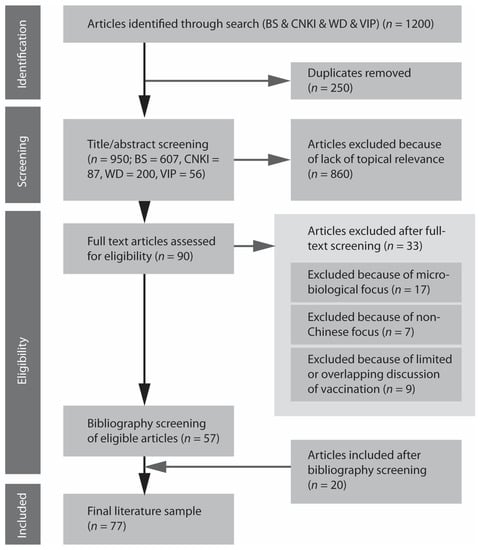 We identified 1200 papers, out of which 250 papers were excluded because they were repeatedly presented in four databases, resulting in 950 papers (see Figure 1). After title and abstract screening, 90 papers were included for full text screening. Out of the 90 articles, 32 papers were excluded for the following reasons: 17 articles focused on the analysis of microbial vaccines, 7 articles studied foreign vaccines, 5 only mentioned vaccines in the conclusions, and 4 had overlapping content. In case of overlap or duplication, we included the oldest publication in the set. In addition, 20 new articles which were not part of the original search results (n = 1200), were included after bibliography screening, as a result of divergent terminological use. Finally, 77 relevant articles were identified for inclusion in the review.