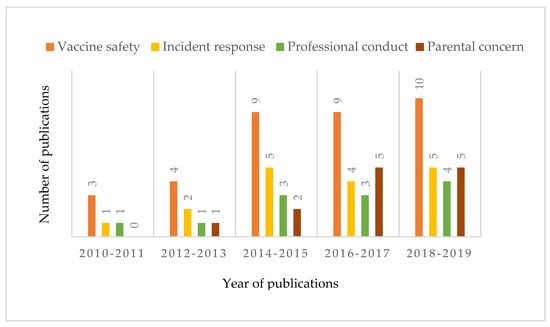 Among the selected articles, we distinguished four different approaches to vaccine and vaccination hesitancy, namely vaccine safety (n = 35), vaccine incident response (n = 17), professional conduct (n = 12), and parental concerns (n = 13) (see Figure 2). This categorisation is based on the three research questions, focussing on the description of the problem, the group assigned responsibility for that problem, and the proposed solutions. Most of the studies focused on unsafe-vaccine-induced hesitancy, and an increasing number of studies on this topic were published between 2010 and 2019. Although the number of studies on parental concerns has increased gradually over the last seven years, such studies were a minority. Most articles on incident response were published between 2014 and 2019, which may be affected by the hepatitis B vaccine incident of 2014, illegal vaccine event of 2016 in Shandong, and Changsheng vaccine scandal of 2018.