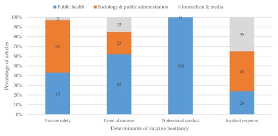 Interestingly, our review revealed that the disciplinary backgrounds of scholars influence how they frame vaccination hesitancy. It appears that 54% of sociology and public policy experts, as well as 43% of public health experts tie vaccination hesitancy to vaccine safety and the governance of vaccine safety. A total of 41% of sociology and public policy experts, as well as 36% of journalists, mentioned inappropriate crisis management and a lack of participatory governance turns as the determinants of vaccine hesitancy. All the public health experts position vaccine hesitancy as a problem related to unprofessional conduct by healthcare professionals and parental beliefs (see Figure 3).
