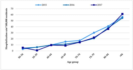 The study population included 437 hospitalized subjects with a primary and/or secondary diagnosis of HZ and 2622 subjects without an HZ diagnosis. The study sample was recruited from the period of 2015–2017. The overall HZ hospitalization rate amounted to 18.16 cases per 100,000 residents. Data stratified by age group and according to admission year showed an increase in hospitalizations with age, reaching rates >50 cases per 100,000 residents in adults aged 84 years and older (Figure 1).
