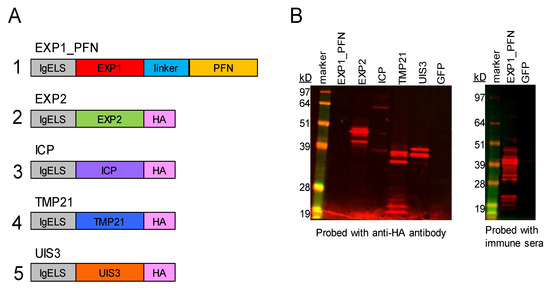 In order to assess in vitro expression of the vaccine constructs, 293T cells (ATCC® CRL-3216™) were plated in 6-well plates at 0.5–0.7 × 106 cells per well in 2 mL DMEM (Gibco) + 10% FBS and incubated overnight at 37 °C in 5% CO2. Cells were transfected with 5 μg DNA using TurboFectin 8.0 transfection kit and incubated for 48 h. After transfection, supernatants and lysates were collected for western blot analysis. Samples were prepared with NuPAGE LDS Sample Buffer, 10× Reducing Agent, and deionized water. Sample mixture was incubated at 70 °C for 10 min. A volume of 25 μL of sample was loaded per well onto an Invitrogen NuPAGE Bis-Tris Gel in 1 × NuPage MOPS running buffer. The gel was run at 150 V for 50 min. Protein was transferred to a methanol activated PVDF membrane using the iBlot 2 Dry Blotting System (Life Technologies, Carlsbad, CA, USA). The membrane was blocked for 1 h at room temperature with Li-Cor Odyssey Blocking Buffer followed by overnight incubation at 4 °C with primary antibody. Primary antibody was either an anti-HA antibody (ThermoFisher, Waltham, MA, USA) to detect expression of the constructs which contain an HA tag, or post-immune sera collected from immunized mice to detect expression of the EXP1_PFN construct which did not have an HA tag. After washing, the membrane was incubated for 1 h at room temperature with IRDye labeled secondary antibody (Li-Cor) and then imaged using an Odyssey CLx imager.