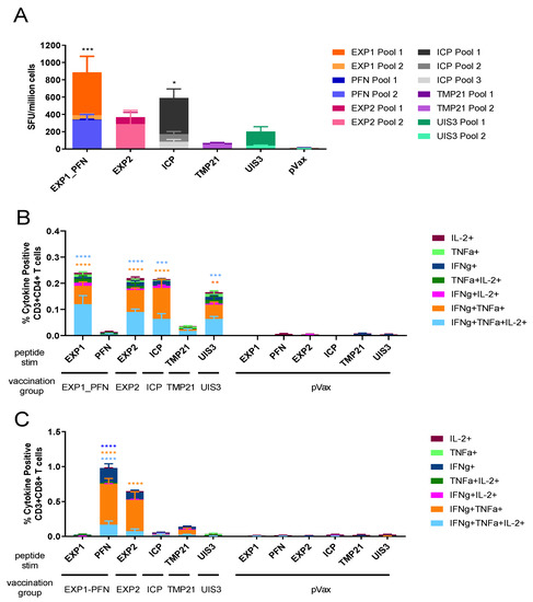 Functional profile of cellular immune responses elicited by individual Py DNA vaccines in mice. Mice were immunized 4 times at 3-week intervals with the indicated constructs. Splenocytes were collected 1 week after the final immunization. (A) The Py antigen-specific cellular immune response measured by IFNγ ELISPOT of splenocytes 1 week after final immunization with the indicated vaccine. Cells were stimulated for 18 h with peptide pools encompassing the entire protein. A one-way ANOVA with Dunnet’s multiple comparison test was used to compare each vaccine group to the pVax control group. (B,C) The Py antigen-specific cytokine production profile of CD4+ (B) and CD8+ (C) T cells from spleens 1 week after final immunization with the indicated vaccine. Cells were stimulated with pooled peptides for 6 h, stained for intracellular production of IFNγ, TNFα, and IL-2, and then analyzed by flow cytometry. The bar graph shows subpopulations of mono-, double-, and triple-positive CD4+ and CD8+ T cells. A two-way ANOVA with Tukey’s multiple comparisons test was used to compare cytokine production between each vaccine group and the pVax control group. Asterix color indicates which cytokines were significantly different between vaccine and control. * = p < 0.05, ** p < 0.01, *** = p < 0.001, and **** = p < 0.0001. Values represent the mean responses in each group (n = 5) ± SEM.