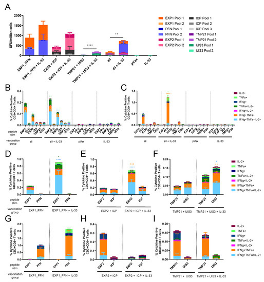 To investigate the immunogenicity of co-formulated vaccine constructs groups of five mice were immunized 4 times at 3-week intervals with combinations of constructs (EXP1_PFN alone, EXP2 and ICP, TMP21 and UIS3, and all constructs together) with and without the molecular adjuvant pIL-33 all delivered in a single injection site. Splenocytes were collected for analysis of the cellular immune response using IFNγ ELISPOT and flow cytometry. All immunization groups saw an upwards trend in IFNγ ELISPOT responses with the addition of pIL-33 (Figure 3A). The functional profile of CD4+ (Figure 3B,D–F) and CD8+ (Figure 3C,G–I) T cells was analyzed by flow cytometry. In the mice immunized with EXP1_PFN alone, CD4+ T cells respond more highly to EXP1 and this phenotype is enhanced in the adjuvanted group (Figure 3D). By contrast, as seen in Figure 3G, CD8+ T cells respond more highly to PFN, and this phenotype is also enhanced in the adjuvanted group. In mice immunized with EXP2 + ICP, CD4+ T cells responded quite similarly to EXP2 and ICP; however, in the adjuvanted group the EXP2 response was preferentially increased (Figure 3E). CD8+ T cells responded more highly to EXP2; however, this phenotype was not recapitulated in the adjuvant group (Figure 3H). In the mice immunized with TMP21 + UIS3, CD4+ T cells responded more highly to UIS3 (Figure 3F), a phenotype that did not change with the addition of pIL-33, whereas CD8+ T cells responded more highly to TMP21 (Figure 3I). As expected, ELISPOT and flow cytometry responses in mice immunized with the empty vector control, pVax, or pIL-33 alone were negligible (Figure 3A–C).