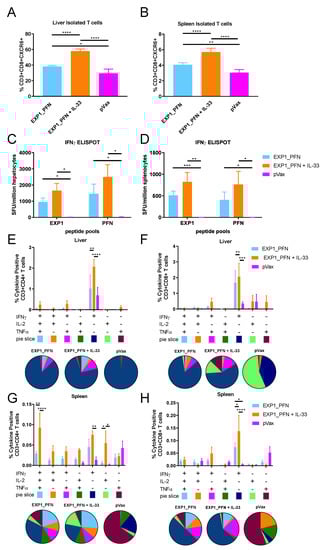 Liver resident T cell responses are considered important for providing protective responses against LS antigens [23,24,25]. The proportion of CD8+ T cells expressing CXCR6 was increased in both the spleen and liver of animals immunized with EXP1_PFN plus pIL-33 compared to antigen alone. This was accompanied by a corresponding increase in the IFNγ production of antigen-specific CD4+ and CD8+ T cells in the liver of animals immunized with antigen plus pIL-33 (Figure 4). Together this suggests improved trafficking of vaccine-induced antigen-specific T cells to the liver.