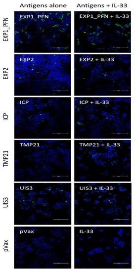 Vaccine-induced antibody production was assayed by immunofluorescence. Hepa1–6 cells were transfected with each DNA vaccine construct. Two days post transfection the cells were probed with post-immune sera from mice immunized with the respective DNA construct (with or without pIL-33) and probed with a fluorescently tagged secondary antibody. Mice immunized with EXP1_PFN showed the most positive staining indicating the highest antibody response. EXP2, ICP, and UIS3 showed intermediate antibody levels and TMP21 showed the lowest levels of antibody induction (Figure 5). The addition of pIL-33 did not appear to alter the amount of detectable antibody binding (Figure 5). However, we cannot conclude whether or not this antibody response is important for the observed immunity, as it is unknown whether these Plasmodium proteins would be available for antibody binding in a physiologically relevant context. It is important to note that while this assay shows the presence of antibodies elicited by vaccination, it does not provide quantitative information on antibody level or titer.
