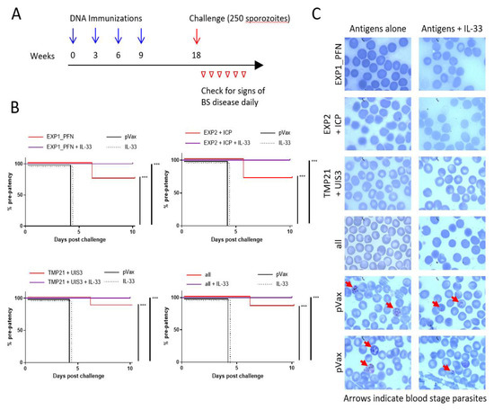 DNA vaccine expressing Py LS antigens provides protection from blood-stage disease after sporozoite challenge. (A) Vaccine and challenge timeline. BALB/cJ mice were immunized 4 times at 3-week intervals with the indicated vaccine co-formulations. Immunization groups were: EXP1_PFN with or without IL-33, EXP2 and ICP with or without IL-33, TMP21 and UIS3 with or without IL-33, and all vaccine constructs together with or without IL-33. Mice were then challenged by injection of 250 P. yoelii sporozoites. Blood smears were examined daily for signs of blood-stage disease. (B) Survival curves showing protection from evidence of blood stage parasites. Log-rank tests were used to compare groups and p-values less than the Bonferroni-corrected threshold are indicated. *** = p < 0.001. (C) Example blood smears from each group. Red arrows indicate blood stage parasites. All antigen immunized groups with and without IL-33 were n = 7 or 8. pVax and IL-33 groups were n = 5. See Supplementary Table S1 for more details.