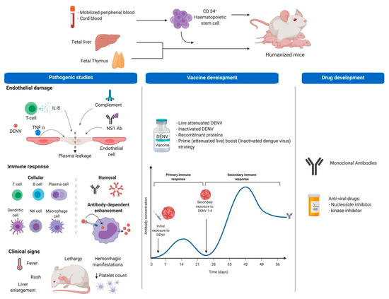 Humanized mice are immunodeficient mice transplanted with human cells or tissues, with a permissive phenotype that allows integration of various human components, for study of human pathogens or disease processes in vivo. The capacity to develop identical cell phenotypes to those observed in humans allows the study of both innate and adaptive immune responses during viral processes like DENV. The models can offer a mechanism to study pathogenesis in mice with a fully intact immune response while also providing human cells that are specifically targeted by the virus during the course of natural infection, and at the same time delivering a mechanism for interrogating viruses in the absence of viral genome adaptation or disruption of the native immune response, with applications in pathogenesis, vaccine and drug development studies (Figure 1).