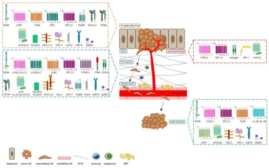 We overviewed selected dysregulated proteins and proteins related to altered signaling pathways with respect to their impact on HCC, as illustrated in Figure 1, and we grouped them according to their structural and biological function in receptors, cell adhesion molecules, transporters, mucins, glycosylphosphatidylinositol-anchored (GPI)-anchored proteins, and other cell surface-bound proteins. For each mentioned protein, we highlighted the molecular mechanisms known to have a role in hepatocarcinogenesis and tumor progression (i.e., tumor growth, angiogenesis, invasion, epithelial–mesenchimal transition (EMT), migration and metastasis) as well as their clinical relevance as biomarkers and/or target candidates for more effective therapies and vaccination strategies against the tumor. We apologize in advance for not reviewing other relevant studies in the field, due to space limitations. Finally, we underlined the completed and ongoing clinical trials targeting the mentioned cell surface proteins we focused on, summarized in Table 1.