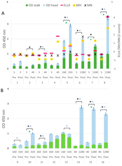 (A) Serum samples from adult subjects tested by ELISA, hemagglutination inhibition (HI), single radial hemolysis (SRH), micro-neutralization (MN) and enzyme-linked lectin (ELLA) assays; (B) Serum samples from adults tested by ELISA and HI assays. The HI titer of each sample is indicated below the x-axis. Blue bars = head signal, and green bars = stalk signal. Asterisks indicate statistical significance; a black asterisk indicates a significant increase in the HA signal; a blue asterisk indicates a significant increase in the head signal; a green asterisk indicates a significant increase in the stalk signal. Error standard bars are reported both for the head and stalk signals.