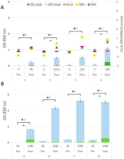 (A) Serum samples from children tested by ELISA, HI, SRH, MN and ELLA assays; (B) Serum samples from children tested by ELISA and HI. The HI titer of each sample is indicated below the x-axis. Blue bars = head signal, and green bars = stalk signal. Asterisks indicate statistical significance; a black asterisk indicates a significant increase in the HA signal; a blue asterisk indicates a significant increase in the head signal; a green asterisk indicates a significant increase in the stalk signal. Error standard bars are reported both for head and stalk signal.
