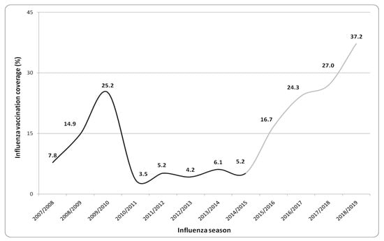 After the 2009/2010 season, a decreasing trend of vaccination coverage was registered until 2014/2015, with an average value of 5% during five consecutive seasons. From the beginning of the communicative and informative interventions, an increasing trend of vaccination adherence was observed from 16.7% in the 2015/2016 season to 37.2% in 2018/2019.