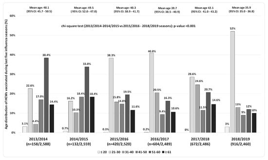 In Figure 2, the age group distribution of vaccinated HCWs during the last six influenza seasons (2013/2014–2018/2019) was reported. In particular, in the last four seasons, there was a considerable increase the proportion of vaccinates of HCWs aged from 21 to 30 years (an age group consistent with medical residents and health-care trainees), which represented 40.8% of all subjects vaccinated in 2016/2017, 29.5% in 2017/2018, and 52% in 2018/2019 seasons.