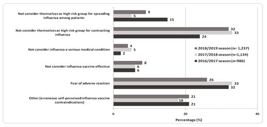 Reasons for not receiving seasonal influenza vaccination, reported in the dissent form during the last three vaccination seasons, are shown in Figure 3. In the 2016/2017 season, fear of adverse reaction (32%) followed by not considering themselves as a high-risk group for contracting influenza (24%) were the main reasons reported. In 2017/2018, both previously mentioned reasons were equally reported as principal (33%) justifications for vaccination refusal. Furthermore, in 2018/2019, not considering HCWs as a high-risk group for contracting influenza (32%) overcame fear of adverse reaction (26%) as the main reason for not vaccination. In the analysis of vaccination refusal, no significant difference emerged between the age groups and types of employees.