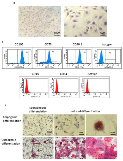 Characterization of mesenchymal stem cells (MSC) isolated from the bone marrow of mice. (a) The morphology of MSC isolated from the red bone marrow of mice is polymorphic cells that exhibit a fibroblast-like shape. The cells were seeded on culture flasks, and, after staining the nuclei with hematoxylin, they were visualized by light microscopy, scale bar, 100 µM (left), and 25 µM (right). (b) These are typical results of MSCs receptor analysis by flow cytometry. For immunophenotyping of MSCs, adhesive cells of the second and third passages were stained with phycoerythrin (PE)-labeled antibodies against CD73, CD90.1, CD105, or PE-labeled antibodies of the corresponding isotype controls, and unlabeled rat antibodies against CD45 or CD34 followed by rabbit antirat fluoresceine isothiocyanate (FITC) conjugate. The isolated MSCs expressed CD105, CD73, and CD90 (upper panel), but did not express CD45 and CD34 (lower panel). (c) The adipogenic (upper panel) and osteogenic (lower panel) differentiation of MSC isolated from the bone marrow of mice. MSCs were grown into an adipogenic or osteogenic medium; the medium was changed twice a week for 20 days (adipogenesis) or 21 days (osteogenesis). Then, MSCs were stained to detect neutral fat inclusions or alkaline phosphatase activity, respectively. Single adipocytes (upper left panel) and osteocytes (lower left panel) were present in the control cultures; arrows indicate spontaneous differentiation, scale bar, 100 µM; induced cultures MSC, arrows indicate fat cells (middle and upper right panel) and osteocytes (middle and lower right panel), (scale bar, 25 µM, and 10 µM, respectively).