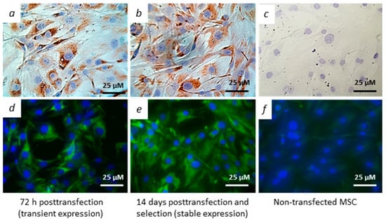 Mesenchymal stem cells (MSCs) are successfully used in various fields of regenerative medicine []. Cell therapy is based on the ability of MSCs to migrate to the sites of pathology. They are able to exert anti-inflammatory and immunomodulatory effects upon allogeneic transplantation, as well as in autoimmune diseases [,,,]. Obtaining genetically modified MSCs expressing introduced genes significantly expands the possibilities of both cellular and genetic therapy, ensuring the delivery of therapeutic molecules to the sites of damage and inflammation [,]. MSCs transduced by the interferon β (IFN-β) gene have been shown to reduce the signs of inflammation and the severity of the disease and to improve the condition of the CNS in experimental multiple sclerosis []. Positive results with modified MSCs have been obtained in myocardial infarction [] and in cancer therapy [].