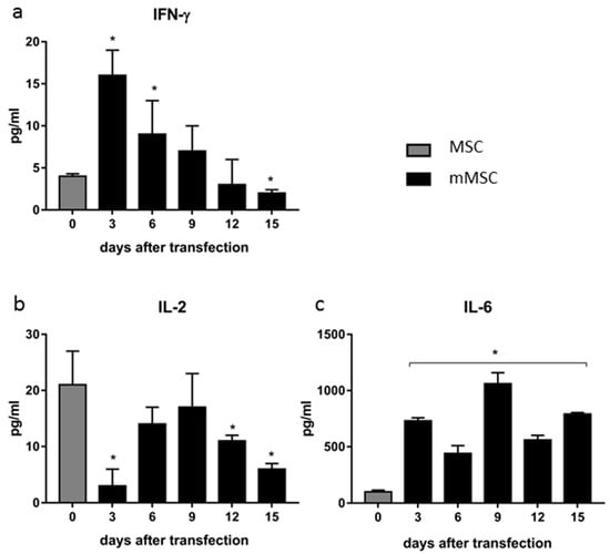 Next, we measured levels of cytokines IL-2, IL-6, IL-10, IL-12, IFN-γ, and TNF-α secreted by MSCs in vitro after transfection of cells with pcNS3-NS5B and sequential selection using G-418. The nontransfected MSCs secreted three cytokines: IFN-γ, IL-2, and IL-6, whereas the other cytokines were not detected in the conditioned medium. The concentration of IFN-γ increased up to the third day post-transfection, and then gradually decreased until the limit of detection at day 15 (end of cell selection) (Figure 3a). Different kinetics was observed in the case of IL-2: after an initial decrease in its level at day 3, its levels were increased at days 6–9 with a second decrease afterwards (Figure 3b). On the contrary, secretion of IL-6 was significantly increased during the entire observation period and exceeded by eightfold at day 15th the levels in the case of the untransfected MSCs (Figure 3c).