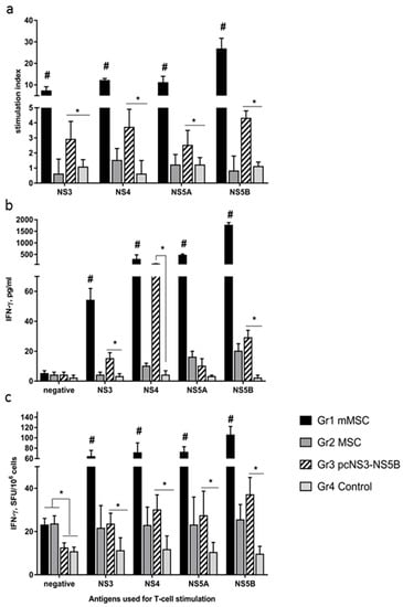 A comparative analysis of the cellular immune response in mice to HCV proteins in vitro after immunization with modified MSC, naïve MSC, and plasmid. Four groups (Gr) of mice were injected twice with mMSC (Gr1), non-transfected MSC (Gr2), plasmid pcNS3-NS5B (Gr3), or saline (Gr4). To assess the cellular response of lymphocytes in vitro, we used purified recombinant proteins from the non-structural region of HCV, which were combined into four pools (NS3, NS4, NS5A, and NS5B). A recombinant HCV core and medium alone were used as negative controls (negative). (a) Results of T-cell proliferation are expressed as stimulation indexes (SI); the IFN-γ production by splenocytes in response to HCV antigens was assayed as cytokine concentrations in culture fluids by ELISA, expressed as pg/ml (b), or as the number of IFN-γ synthesizing cells by ELISpot in the number of spot forming cells (SFC) per 106 cells (c). Values on each diagram are means ± SD of three measurements done in three independent experiments. * p < 0.05 compared to control; # p < 0.05 compared to all groups.