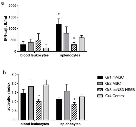 To date there are only two papers investigating immune response to MSCs that express viral proteins. The first one describes the cells that express human immunodeficiency virus (HIV) Gp120 []. The second, recently published by Bolhassani et al. (2019) showed immunization of mice by mMSC that express E7 protein of human papillomavirus (HPV E7 antigen) in a complex with small heat shock proteins leads to a strong T-cell immune response and to a partial protection of animals against HPV-induced tumors []. Our data present a first evidence that modified MSCs (mMSCs) expressing HCV proteins affect innate and adaptive immune responses in mice. The experimental data show that the administration of naïve or modified MSCs to mice increases both spontaneous and ConA-induced levels of lymphocyte proliferation. Assessment of the proliferative response to mitogens is one of the most universal tests to assess the lymphocyte function; a weak reaction indicates the failure of cellular immunity. The functional activity of activated lymphocytes (production of IFN-γ) increased. The biological activity of IFN-α/β increased, as established in the test with the inhibition of the cytopathogenic effect of the encephalomyocarditis virus. Type I IFNs are known to play an important immunoregulatory role in relation to both the innate and adaptive immune responses to viral infections. For example, IFN-α/β induces the cytotoxicity of NK cells and increases the expression of MHC class I and co-stimulating molecules on antigen-presenting cells (APCs) []. A comparison of the effectiveness of these parameters of the innate immune response to mMSC with the response to immunization with a DNA construct shows that in the latter case the immune cells induce IFN-α/β and IFN-γ at a lower level. When mice were immunized with DNA, the phagocytic activities of monocytes/macrophages, neutrophils and dendritic cells decreased as well. In contrast, the functions of phagocytic cells during immunization with MSCs and mMSCs remained at the level of healthy intact mice.