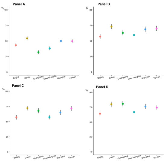 Influenza vaccination attitudes of telephone survey respondents during the October 2017 to March 2018 influenza season in six provinces of China. Panel (A) Willingness for influenza vaccination during the 2018/2019 influenza season in China; Panel (B) Willingness for influenza vaccination during the 2018/2019 influenza season on the condition that the influenza vaccine was recommended by their doctors; Panel (C): Willingness for influenza vaccination during the 2018/2019 influenza season on the condition that the influenza vaccine was free; Panel (D): Willingness for influenza vaccination during the 2018/2019 influenza season on the condition that their employer supported the influenza vaccination; Panel (E): Willingness for recommendation of influenza vaccination to one’s family members influenza vaccination during the 2018/2019 influenza season.