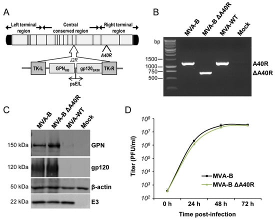 To study the virus growth profile of MVA-B, MVA-B ΔA40R, and MVA-B ΔA40R-rev, monolayers of DF-1 cells grown in 12 well plates were infected in duplicate at 0.01 PFU/cell with the different viruses. Following virus adsorption for 60 min at 37 °C, the inoculum was removed. The infected cells were washed with DMEM and incubated with fresh DMEM containing 2% FCS at 37 °C in a 5% CO2 atmosphere. At different times (0, 24, 48, and 72 h.p.i.), cells were collected by scraping, freeze–thawed three times, and briefly sonicated. Virus titers in cell lysates were determined by immunostaining plaque assay as previously described [].