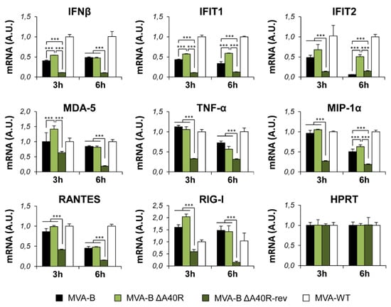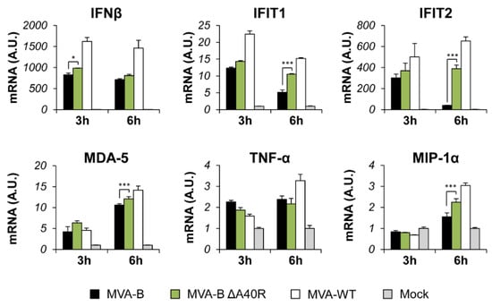 MVA-B ΔA40R upregulated the levels of type I IFN, proinflammatory cytokines, and chemokine expression compared to parental MVA-B. Human THP-1 macrophages were mock infected or infected with MVA-WT, MVA-B, or MVA-B ΔA40R at 5 PFU/cell. At 3 and 6 h.p.i., RNA was extracted, and IFN-β, IFIT1, IFIT2, MDA-5, TNF-α, MIP-1α, and HPRT mRNA levels were analyzed by RT-qPCR. Results are expressed as the ratio of the gene of interest to HPRT mRNA levels. A.U., arbitrary units. p values indicate significant response differences between MVA-B and MVA-B ΔA40R at the same hour (*, p < 0.05; ***, p < 0.001). Data shown are means ± standard deviations of triplicate samples from one experiment and are representative of two independent experiments.