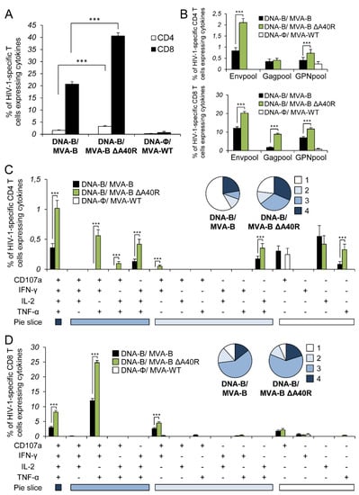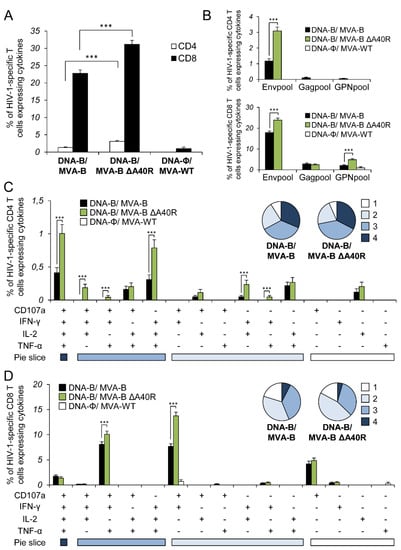 Immunization with MVA-B ΔA40R enhanced the magnitude of HIV-1-specific CD4+ and CD8+ T-cell adaptive immune responses. Splenocytes were collected from mice (n = 4 per group) immunized with DNA-ϕ/MVA-WT, DNA-B/MVA-B or DNA-B/MVA-B ΔA40R 10 days after the last immunization. Next, HIV-1-specific CD4+ and CD8+ T-cell adaptive immune responses triggered by the different immunization groups were measured by ICS assay following the stimulation of splenocytes with different HIV-1 peptide pools (Env, Gag, and GPN). Values from unstimulated controls were subtracted in all cases. p values indicate significant response differences between the DNA-B/MVA-B ΔA40R and DNA-B/MVA-B immunization groups (***, p < 0.001). Data are from one experiment representative of three independent experiments. (A) Overall percentages of HIV-1-specific CD4+ and CD8+ T cells. The values represent the sum of the percentages of T cells expressing CD107a and/or IFN-γ and/or TNF-α and/or IL-2 against Env, Gag, and GPN peptide pools. (B) Percentages of Env, Gag, and GPN HIV-1-specific CD4+ and CD8+ T cells. Frequencies represent the sum of the percentages of T cells expressing CD107a and/or IFN-γ and/or TNF-α and/or IL-2 against Env, Gag, or GPN peptide pools. (C,D) Polyfunctional profiles of HIV-1-specific CD4+ (C) and CD8+ (D) T cells. All of the possible combinations of responses are shown on the x axis, while the percentages of T cells expressing CD107a and/or IFN-γ and/or TNF-α and/or IL-2 against Env, Gag, and GPN peptide pools are shown on the y axis. Responses are grouped and color-coded on the basis of the number of functions (4, 3, 2, or 1). The pie charts summarize the data. Each slice corresponds to the proportion of the total HIV-1-specific CD4+ and CD8+ T cells exhibiting 1, 2, 3, or 4 functions (CD107a and/or IFN-γ and/or TNF-α and/or IL-2) within the total HIV-1-specific CD4+ and CD8+ T cells.