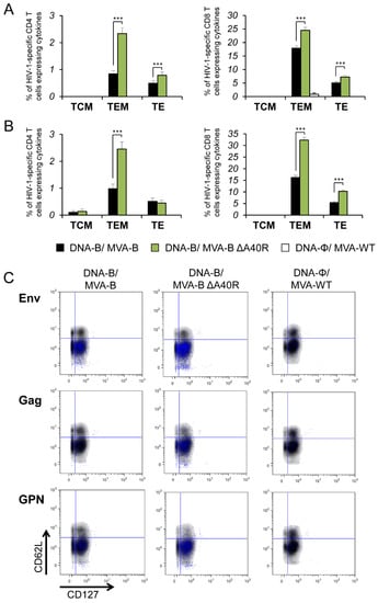 It has been described that HIV-1-specific T cells with a mature effector memory phenotype are more frequently detectable in HIV-1 controllers than in HIV-1 progressors [,,]. Thus, we next determined the phenotype of the adaptive and memory HIV-1-specific CD4+ and CD8+ T cells by measuring the expression of the CD127 and CD62L surface markers, which allowed the definition of the different memory subpopulations: T central memory (TCM, CD127+/CD62L+), T effector memory (TEM, CD127+/CD62L−), and T effector (TE, CD127−/CD62L−) cells [], and determined the sums of the individual responses expressing CD107a, IFN-γ, TNF-α, and/or IL-2 obtained for the Env, Gag, and GPN peptide pools (Figure 5). The results showed that in both vaccinated groups, adaptive and memory HIV-1-specific CD4+ and CD8+ T cells were mainly of the TEM phenotype, followed by the TE phenotype. However, immunization with DNA-B/MVA-B ΔA40R induced a significant increase in the percentage of adaptive and memory HIV-1-specific CD4+ and CD8+ TEM and TE cells (Figure 5A,B). Representative flow cytometry plots of memory HIV-1-specific CD8+ T cells against Env, Gag, and GPN peptide pools are shown in Figure 5C.